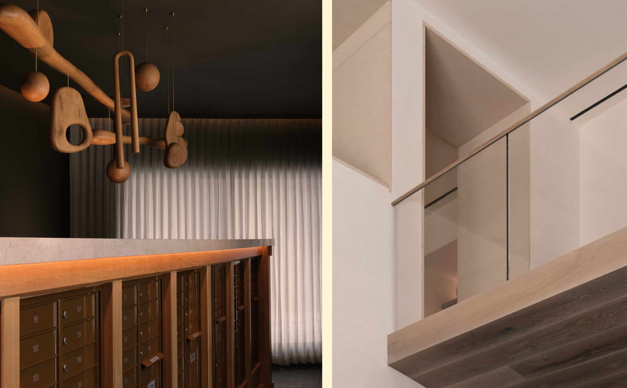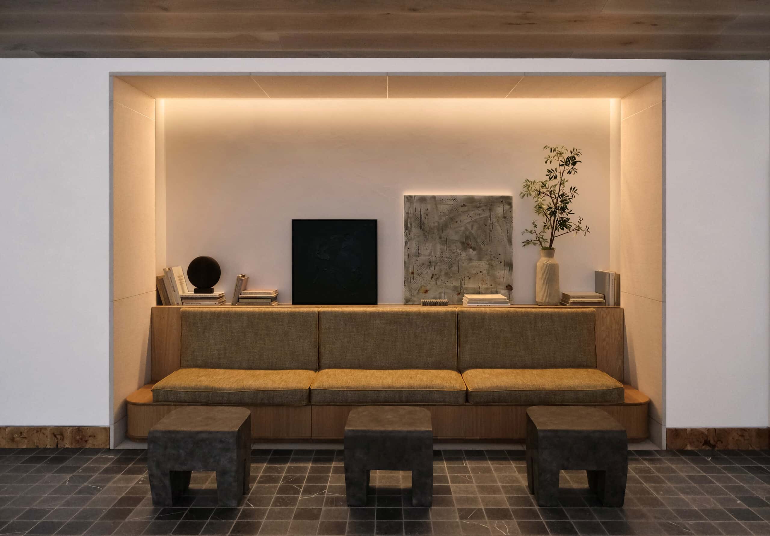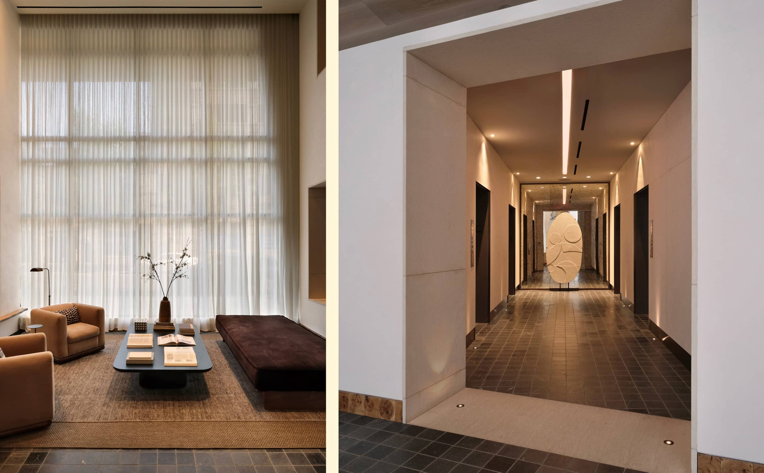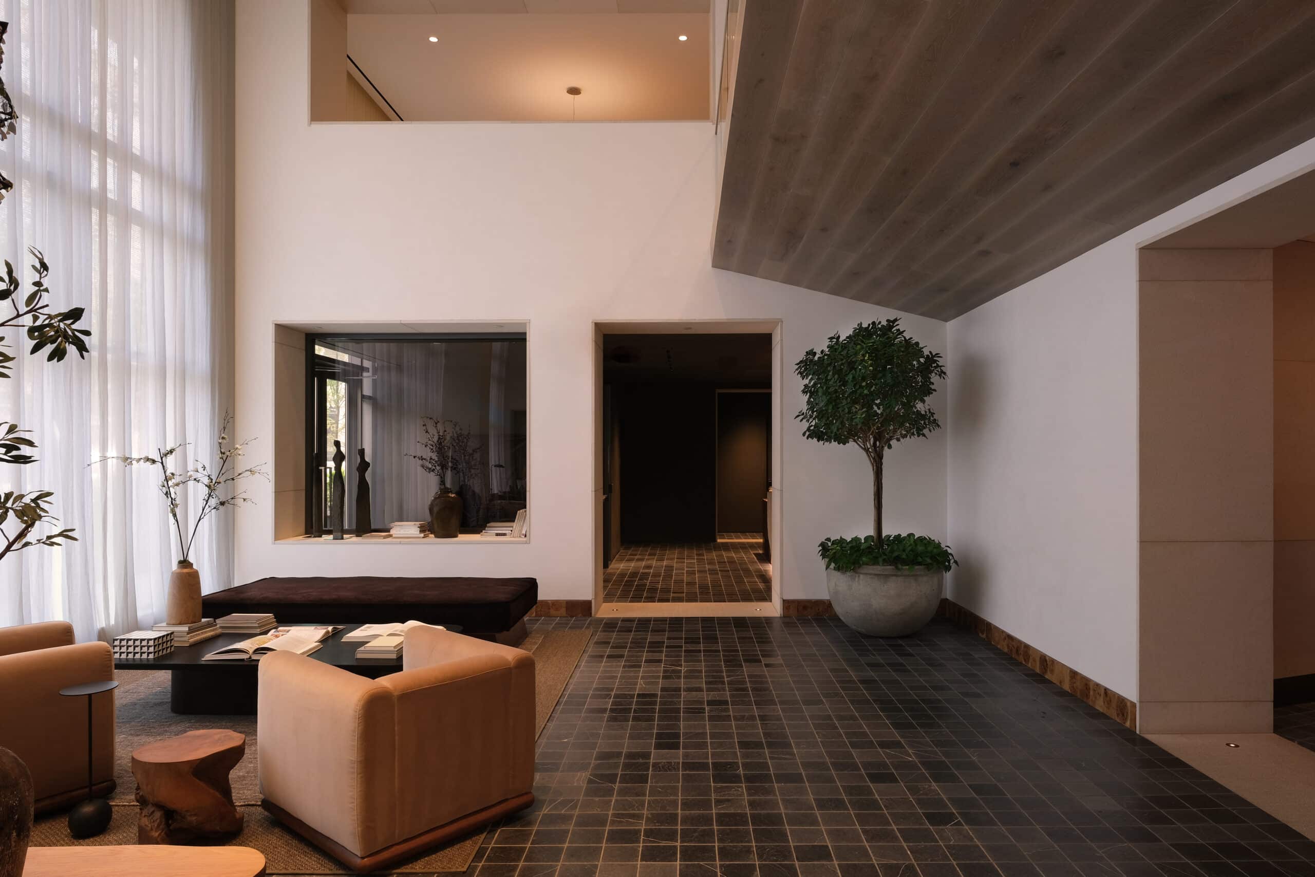 The Wendy brings a refined minimalism to a series of high-contrast spaces defined by light, texture, and craft. Hammered limestone, end grain oak, and marble lend weight and permanence to an interior palette that alternates between soft, airy openness and moody, dramatic depth.
